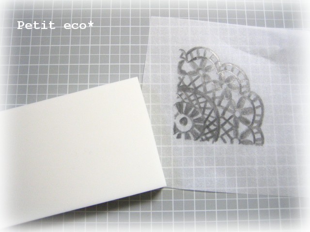 ②トレーシングペーパーを裏返して、つめでこすり、図案を消しゴムに写します。